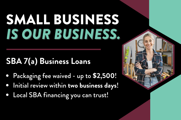 We know small business because we are a small business. Locally rooted, relationship driven and focused on long-term success. For a limited time, we have a special offer on SBA 7(a) Business Loans* to support what you're building with a process that's efficient, thoughtful and tailored to your needs.
